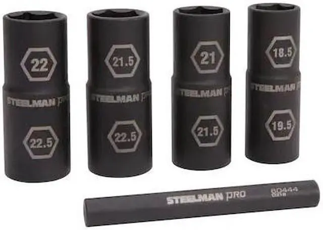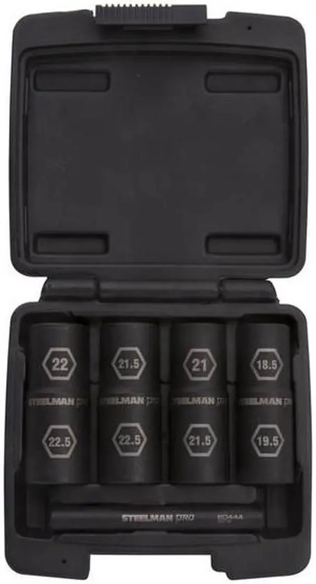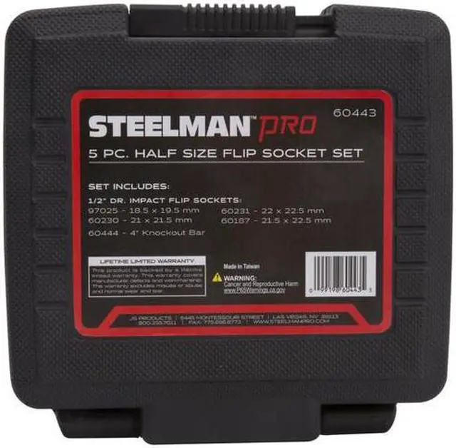 California Proposition 65: This product contains a chemical known to the State of California to cause birth defects or other reproductive harm. Designed with efficiency in the face of even the busiest shops the STEELMAN 60443 5-Piece 1/2-Inch Drive 6-Point Impact Flip Socket and Knockout Bar Set helps save time by doubling the number of fasteners each socket can fit. Included in the set are 4 dual ended, 6-point impact grade flip sockets fitting 18.5 mm, 19.5 mm, 21mm, 21.5 mm, 22mm, and 22.5 mm lug nuts with some overlap between sockets to allow maximum usability between multiple technicians. Made of durable and hardened chromoly steel which is then given a black oxide protective coating, these sockets are designed to meet or exceed 150% proof of torque under ASME tool performance testing standards. Fitting easily over an impact extension or onto an impact wrench's extended anvil, these socket's recessed edges provide the most accurate fit possible, gripping fasteners by the sides and not the edges which results in reduced slippage and rounding/fastener damage. Laser-etched size callouts make identification among other sockets easy. To help deal with lug nuts that get too at home inside the sockets the set includes a 4-inch chrome-vanadium steel knockout bar that can be used to push the stuck lug out of the socket.