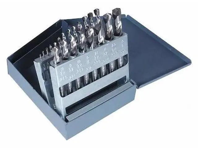 Screw Machine Drill Bit Set, Number of Drill Bits 21, 135 Degrees Drill Bit Point Angle, High Speed Steel, Bright (Uncoated), Drill Bit Sizes Included 1/16 in, 1/4 in, 1/8 in, 11/32 in, 11/64 in, 13/64 in, 15/64 in, 17/64 in, 19/64 in, 21/64 in, 23/64 in, 3/16 in, 3/32 in, 3/8 in, 5/16 in, 5/32 in, 5/64 in, 7/32 in, 7/64 in, 9/32 in, 9/64 in, Fractional Inch, Drill Bit Point Type Split Point.