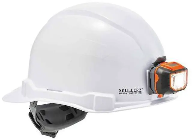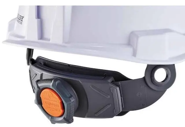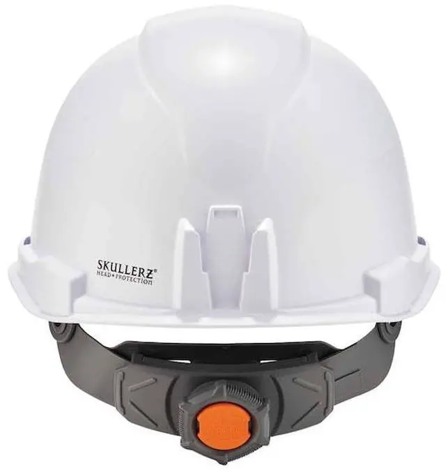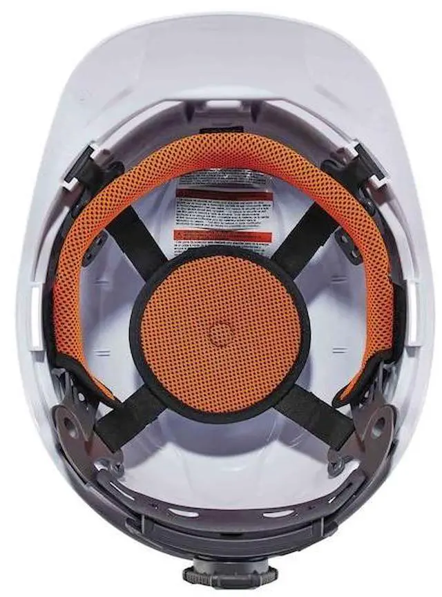 California Proposition 65: This product contains a chemical known to the State of California to cause birth defects or other reproductive harm. White Class E Hard Hat Cap w/Ratchet Sus