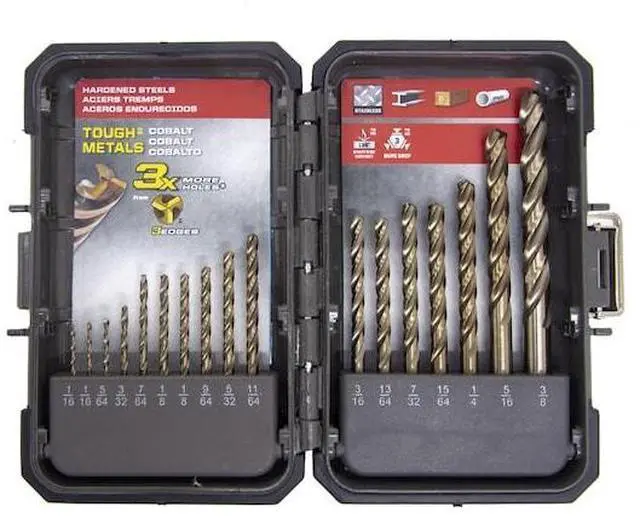 California Proposition 65: This product contains a chemical known to the State of California to cause birth defects or other reproductive harm. Set of 17 premium cobalt Tri-Bore drill bits made with M35 steel containing 5% cobalt for superior strength and heat resistance. Their third cutting edge increases the cutting surface area allowing for 17% faster cutting while reducing heat buildup and wear to improve service life up to three times longer than standard cobalt drill bits. The third cutting edge starts on drill bits with 1/8 in (3 mm) diameter and larger. MIBRO Tri-Bore cobalt drill bits fully ground manufacturing ensures straighter, more precise holes. A thicker core increases the drill bits' rigidity and strength. These drill bits are suitable for the heaviest and most demanding user for drilling in all ferrous and nonferrous metals, including hard steels like stainless steel. For a sure grip, all sizes 3/16 in ( 4.76 mm) in diameter and larger have three flats on the bit's shank. Their 135° split-point tip geometry on all bits 1/8 in (3 mm) in diameter and larger eliminates the need for a center punch and keeps the drill from "walking" on hard surfaces.