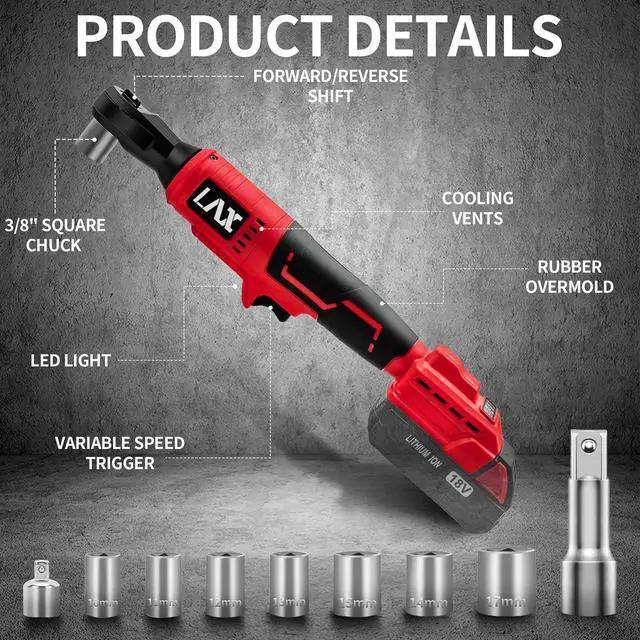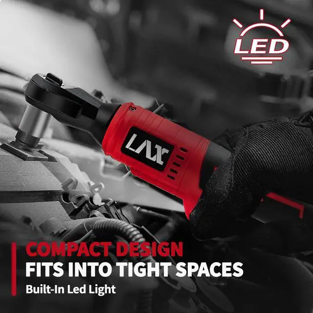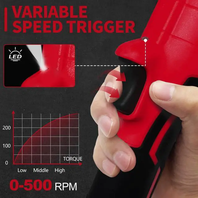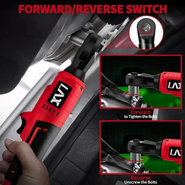 VARIABLE FORWARD/RESERVE SWITCH & BUILT-IN LED : Variable speed trigger helps you optimize speed based on application. The Forward/Reserve switch can change the ratchet wrenchs rotating direction and meet both tightening or loosing the bolts. On-board LED light helps to illuminate low light space and let you see clearly to work easily. And the on-board battery electric displays will let you know how much power you have left