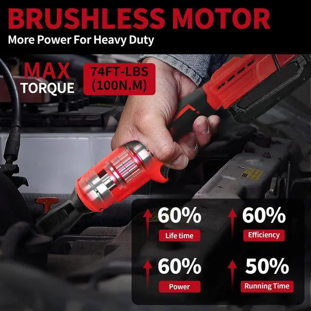 HIGH TORQUE BRUSHLESS MOTOR : 3/8" cordless ratchet wrench delivers 74 Ft-lbs of max torque and 0-500 no-load RPM for use with a wide variety of fastener sizes and applications. It helps you to remove or install bolts or nuts and allow you to perform mechanical, automotive and home repair jobs effortlessly. Many professionals and DIYers are moving in the direction of brushless motors, enjoying a longer running time, lower noise, lower defective rate and a more efficient experience