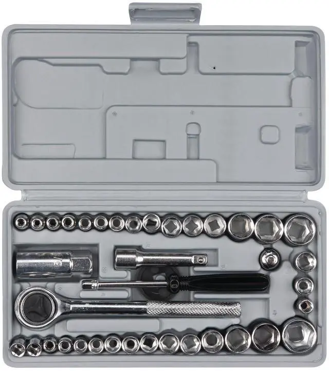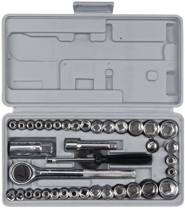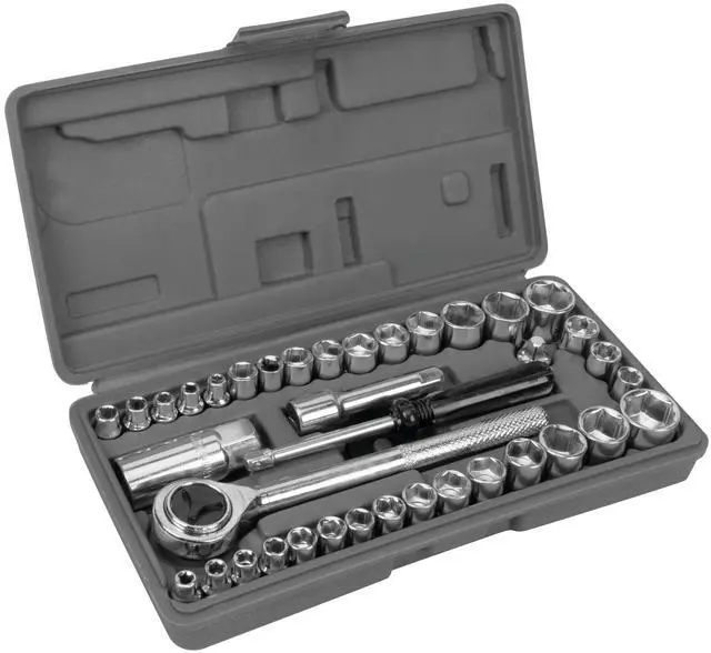 | Overview | 40-piece socket set with ratchet, extension bar and more. Includes spark plug socket. 1/4 in. and 3/8 in. drive sizes. | 26-piece socket set featuring a variety of drive tools and sockets for automotive repair. Made from chrome vanadium steel. | 36-piece mechanic's socket set featuring chrome vanadium steel construction. Features a high torque quick release ratchet. | 40-piece mechanic's socket set with a high torque quick release ratchet. Includes a variety of sockets in both SAE and metric sizes. | 60-pc socket set with ratchets, bits, and case. 1/4 and 3/8 inch drivers and sockets. | 85-piece socket set featuring a wide range of SAE and metric sockets, plus hex keys and driver bits. |
