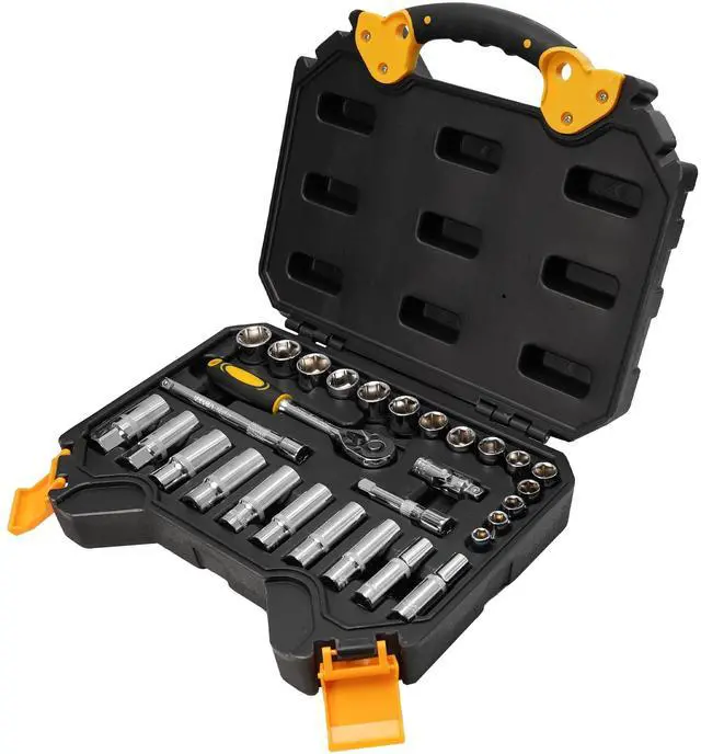 Socket Set – Includes metric shallow and deep sockets, spark plug sockets, ratchet, extension bar, and universal joint. A sturdy mechanics tool set made of premium CR-V steel, neatly stored in a portable case for car, bike, and home repairs.