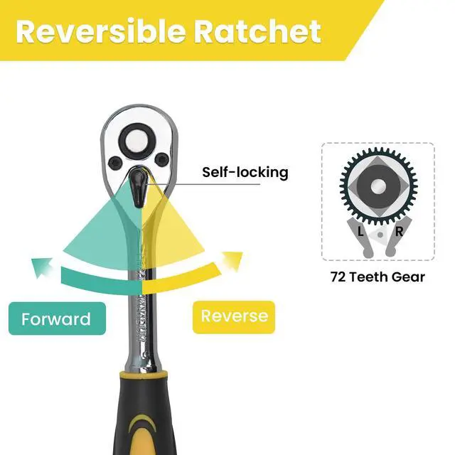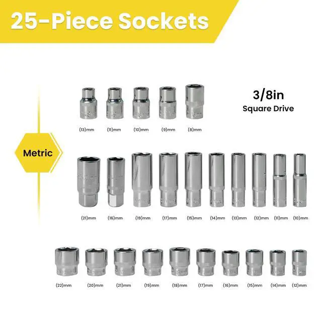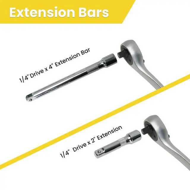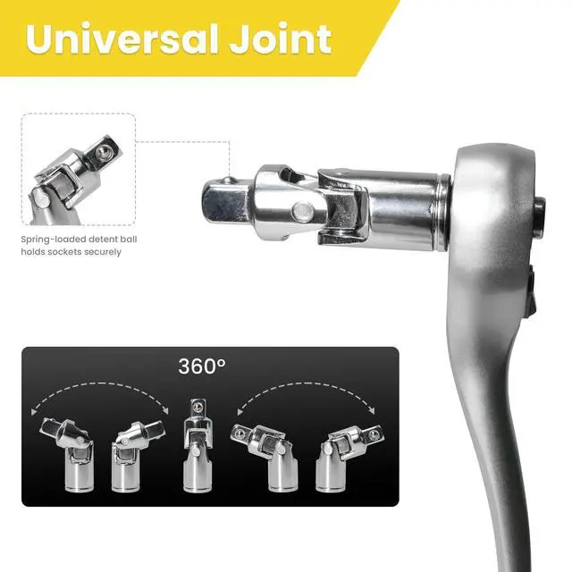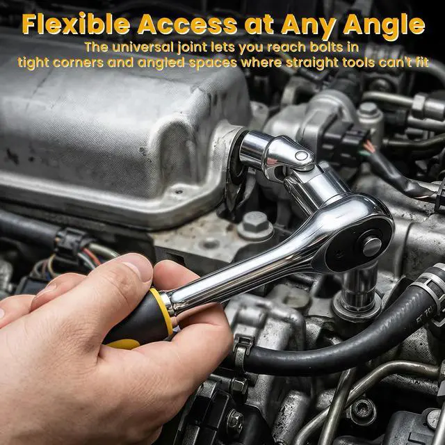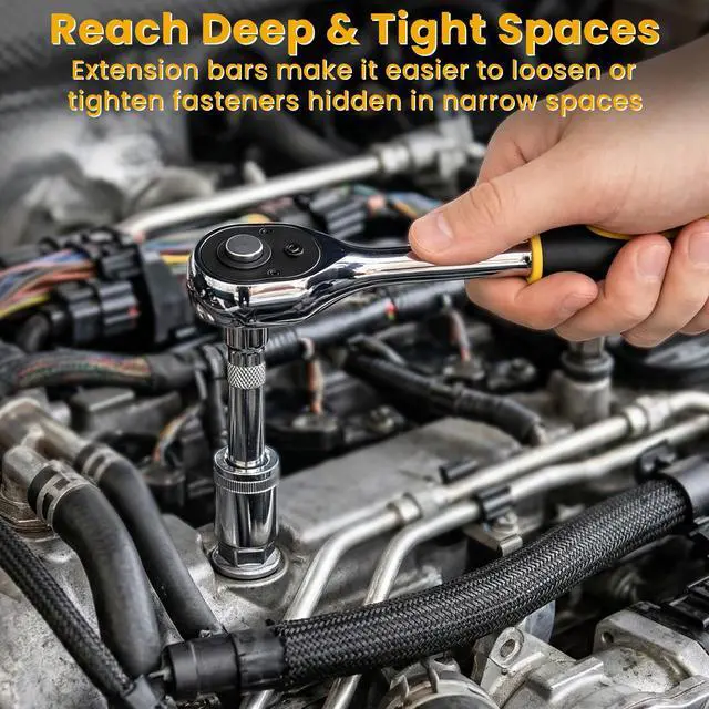 Tackle hard-to-reach bolts with the universal joint and ratchet, designed to work seamlessly with metric sockets and deep sockets. This versatile socket wrench set makes automotive, bike, and home repairs easier even in tight spaces.