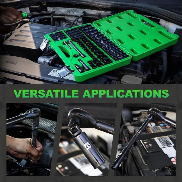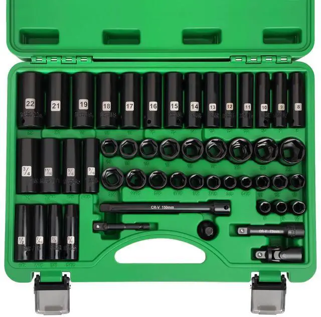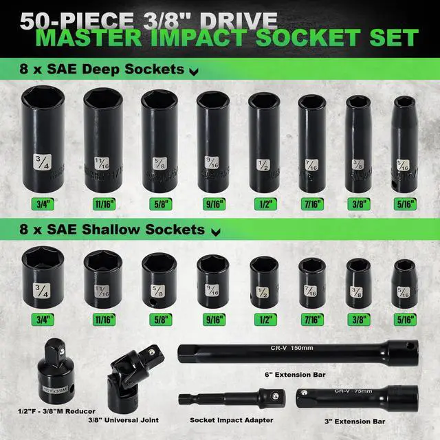 • Various sizes: The 50pcs 3/8" socket set includes 14pcs deep metric socket 8, 9, 10, 11, 12, 13, 14, 15, 16, 17, 18, 19,21, 22mm,15pcs Shallow metric socket: 8, 9, 10, 11, 12, 13, 14, 15, 16, 17, 18, 19, 20, 21, 22mm; 16PCS SAE socket: 5/16", 3/8, 7/16", 1/2", 9/16", 5/8", 11/16", 3/4"; 2PCS extension bar: 3", 6; 3/8 impact universal joint, 1/2 to 3/8 socket adapter, 1/4" Extension Bar