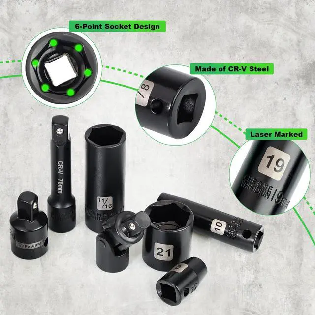 • 6-Point Socket: The 6-point Socket drive design grips fastener more tightly on the flat sides and prevents rounding off at corners. It comes with 3" and 6" extension bars, plus a 3/8" impact universal joint that allows access to confined spaces and flexible angle adjustments.