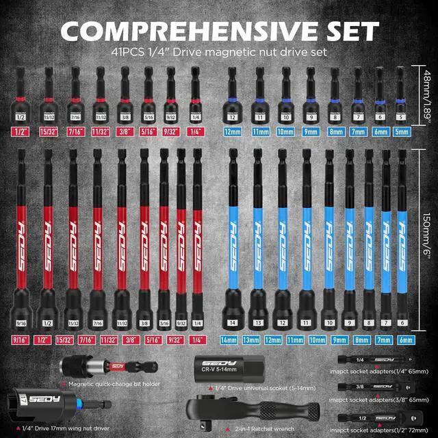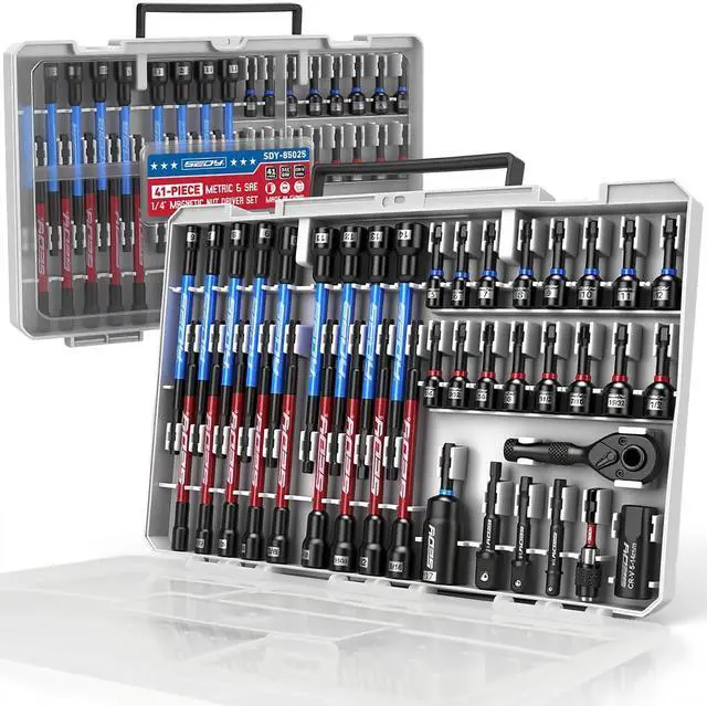 This 41-piece magnetic impact nut driver set is a must-have for any DIYer or mechanic. With both Metric & SAE nut drivers, a universal socket, and ratchet wrench, this set offers superior durability and efficient performance. Perfect for auto repairs, home installations, or general maintenance, its the best option for tackling any project with magnetic retention, quick change convenience, and exceptional strength.