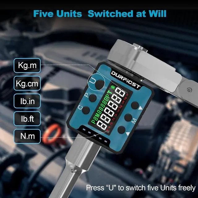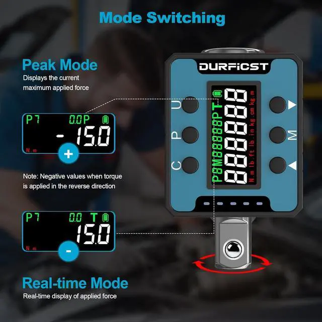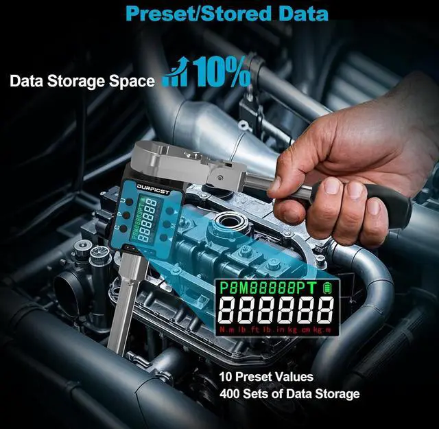 Functional Highlights This digital torque adapter provides forward/reverse bidirectional use functions, which improves work efficiency. The accuracy of this torque adapter is as high as ±2%. It has five torque units: Kg.cm/N.m/Ib.ft/Ib.in/Kg.m, which can be switched freely. The maximum storage data of the adapter is 400 groups, which are displayed as M000-M399. When you need multiple groups of data, the torque wrench adapter can provide you with quick operation.