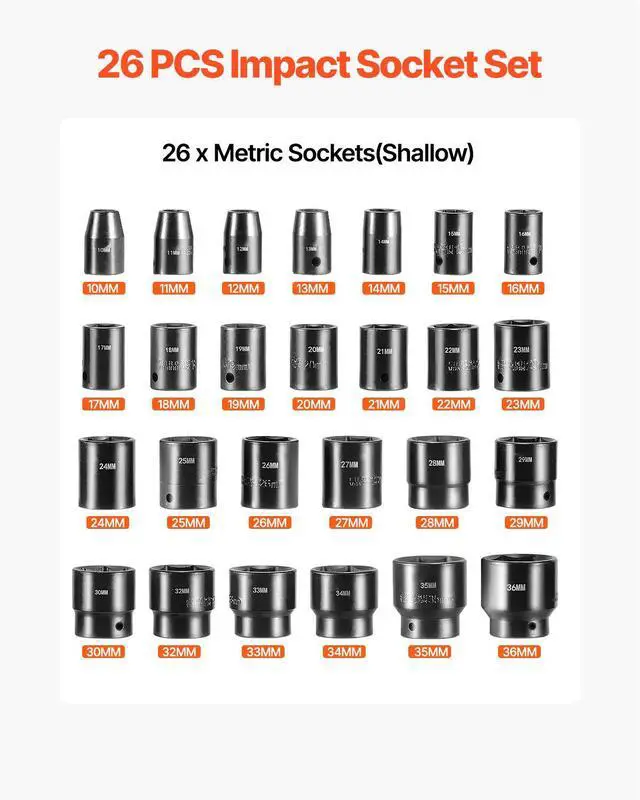 26 x 1/2 inch Sockets: 10mm - 36mm