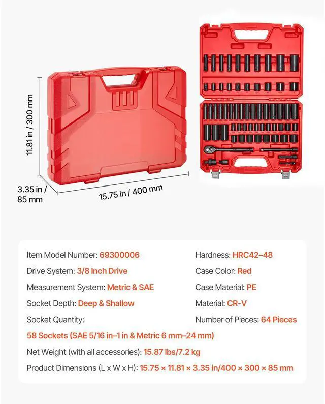 Socket Quantity: 58 Sockets (SAE 5/16 in1 in & Metric 6 mm24 mm)