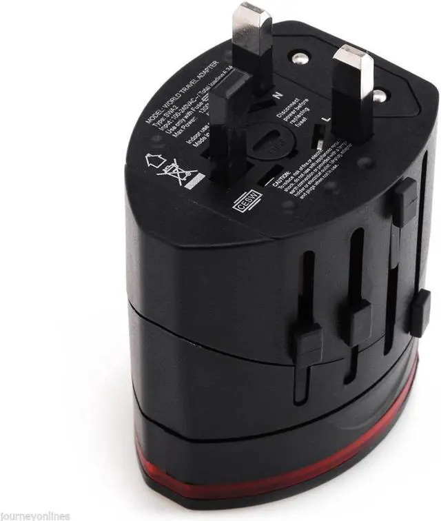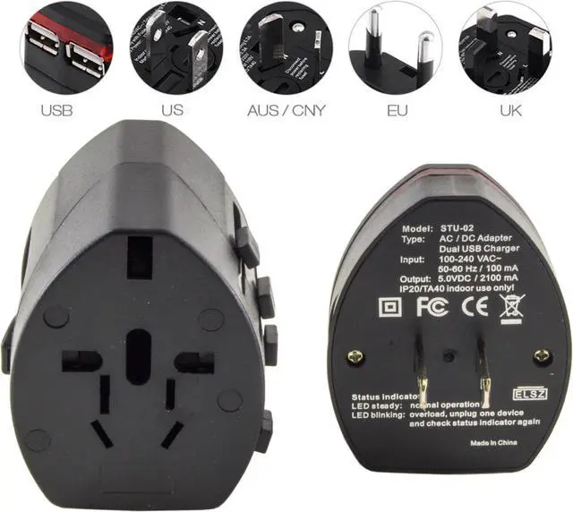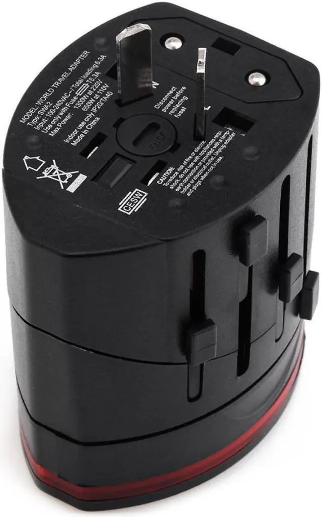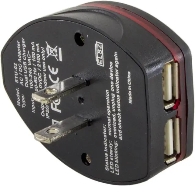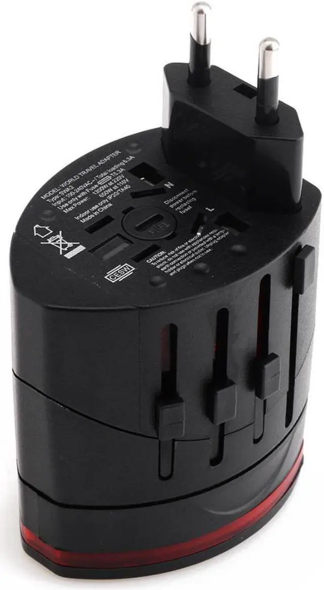 Input: 100-240V AC. Total Loading: 6.3A. Max Power: 1300W at 220V and 650W at 110V. Unit Dimensions: 2.51" x 2" x 2". USB Charger Output Max: 5.5V 1000mAh. Indoor use only. Includes instruction manual. Note: This adapter is not suitable for high power electrical appliances. Model number: IP20/TA40.