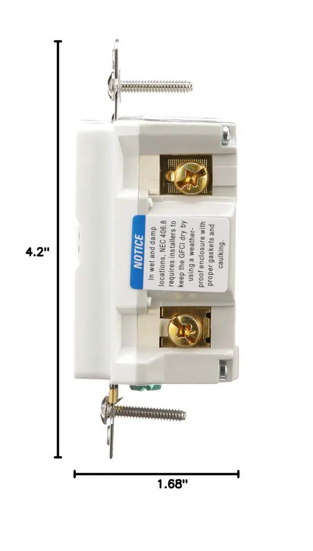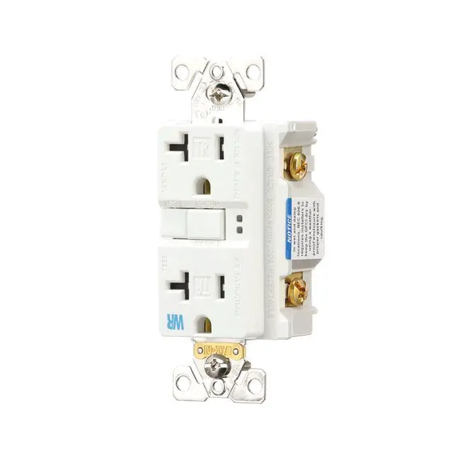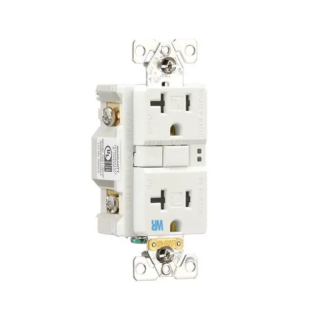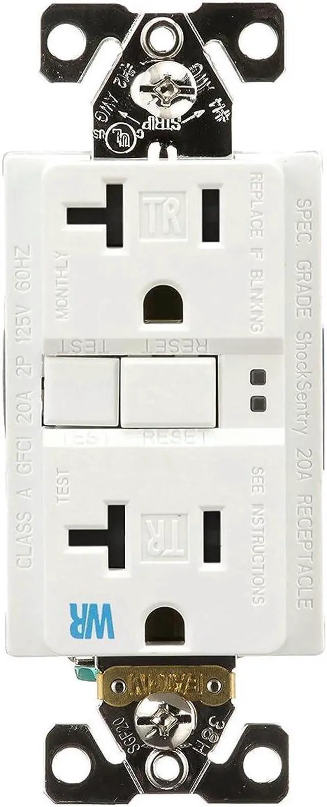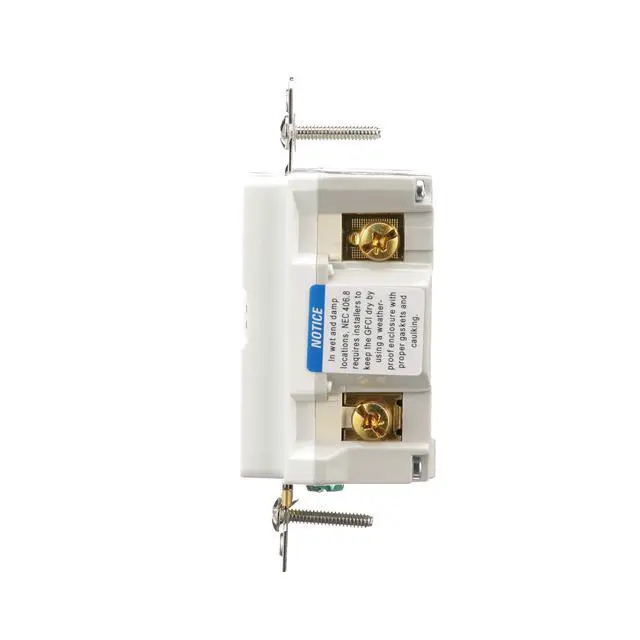 Arrow Hart Duplex GFCI receptacle, series: twrsgf, tamper and weather resistant, 2 pole, 3 wires, 14 - 10 AWG wire, 20 a, 125 vac, 60 hz, 1, 5-20r, wall mount, self-grounding, 2000 V dielectric, 4.2 in overall length, 1.68 in overall width, thermoplastic and PVC bottom housing, White, -35 to 66 deg c, includes: wall plate, cul us listed, UL listed, Nom certified, CSA requirements, back and side wire, tamper and weather resistant, 0.025 sec trip time, for commercial and industrial areas like public bathrooms, breakrooms, food service areas and for indoor use. Eaton GFCI self-test tamper and weather resistant Duplex receptacle provides protection from dangerous electrical shocks caused by ground faults. Our GFCI devices automatically self-test periodically to ensure GFCI protection and continuous safety. In addition to being tested to the highest standards to help ensure safety, Eaton GFCIs will deny power and prevent re-setting if the device is no longer able to provide safe, protected power. The built-in indicator lights provide quick notification of a tripped or end of life condition. Additionally, tamper and weather resistant (steel two) GFCIs provide both tamper resistant safety and ensure weather resistant in wet and damp outdoor locations.