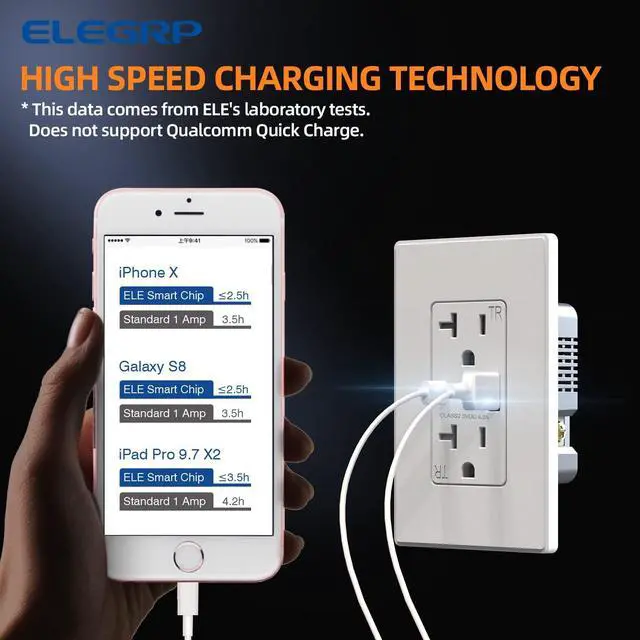 • High-Speed Charging Tech In-wall duplex receptacles with two USB charging ports with a total output of 4.2 Amp 5V DC. When use separately, the maximum output of the Type C port is 3.0 Amp 5V DC, and the Type A port is 2.4 Amp 5V DC.