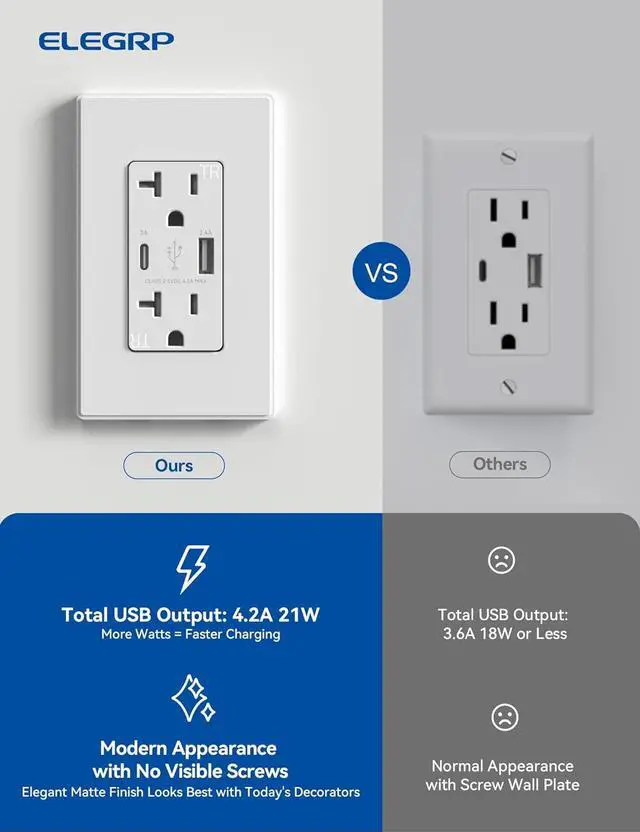 Easy to install Support side wiring and back wiring. All screws have been loosened for ease of installation, there's no need to loosen the screws counterclockwise before wiring. Fits in a standard wall box. Can replace existing outlets. Compatible with standard wall plates and can be multi-ganged with other devices. Providing more space for maneuvering and reducing stress on USB cables.