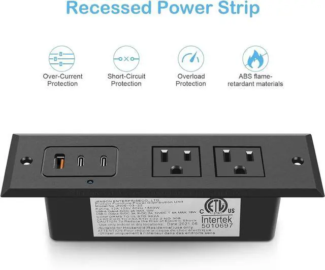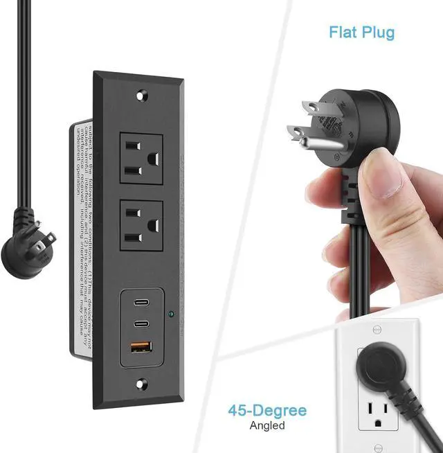 Recessed power strip with fast charging QC 3.0 36W Max USB-A port and 2 PD 3.0 45W Max USB-C ports. Come with 2 standard US sockets. Great addition to nightstand or furniture table.