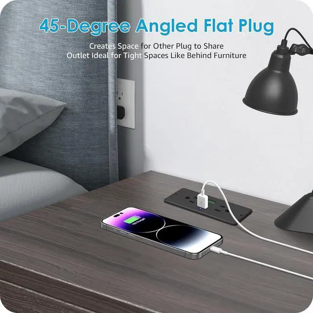 Recessed Outlet Strip with Flat Plug: The 45 degree flat plug saves space and provides space for other plugs to share the socket Ideal for tight spaces such as behind furniture. It has all the power a person would reasonably need at their desk or work station, create less clutter and have a more organized desk area, in use and that it is not taking up floor space or counter space.