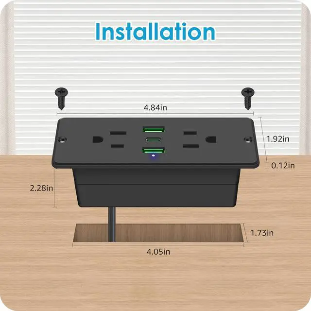 Furniture Hidden Charging Station: Desk hole cut size: L 3.89" * W 1.61", Need space under the table: 1.53inch, it will be 0.12" higher than the surface after install. It comes with the two screws needed to mount it. After you make your cut to size, the power strip drops in place and covers the gap nicely. Even if its a rough cut, the top of the power strip is larger than the opening, hiding any imperfections. This would be ideal to do a recess install into a desk or workbench.