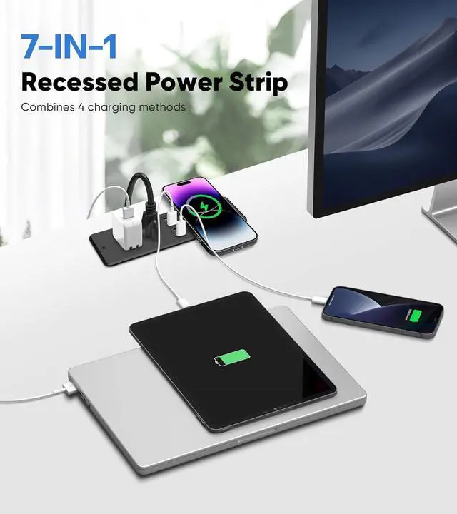 Recessed Outlet with Wireless Charging: This recessed power strip features 2 AC outlets (125V/12A/1500W), 4 USB ports (1 PD 20W USB-C, 1 QC3.0 20W USB-A, and 2 10W USB-A/USB-C), and a 15W wireless charging pad, providing a convenient solution for both wired and wireless charging.