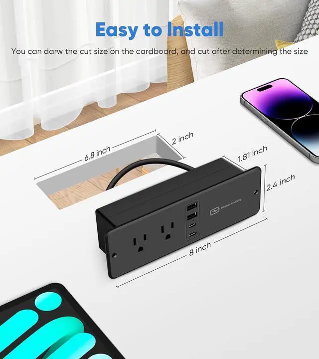 Multifunctional Hidden Charging Station for Desk: Designed for easy installation, the desk hole cut size is L 6.8" x W 2", with a required space of 1.81 inches under the table. Simply draw the cut size on a cardboard template and cut once you confirmed the dimensions. The 10ft power cord is located at the bottom, ensuring no scratches or safety hazards.
