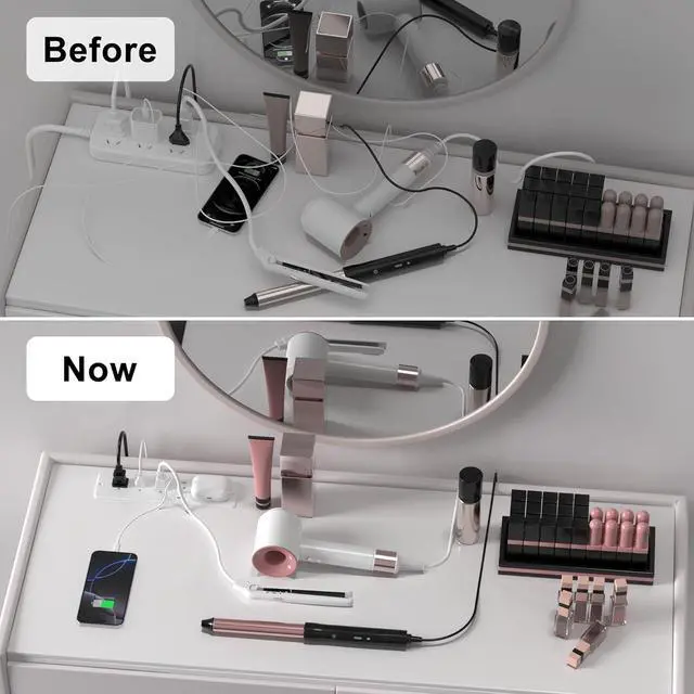 Built in Flush Mount Power Strip L 8.5 * W 2", with Screws. Classic style designed specifically for desktop, hide the socket. Reserved a widely spaced outlet to plug desk electronic accessories large plugs. Furniture hidden charging station for side table end table.