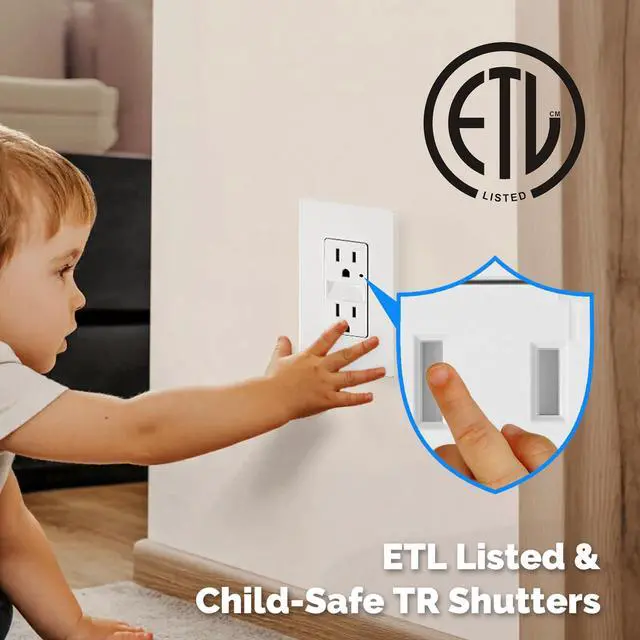 Yes. It is ETL Listed for certified safety and features Tamper-Resistant (TR) shutters. These internal guards are designed to help prevent children from inserting foreign objects.