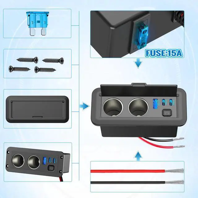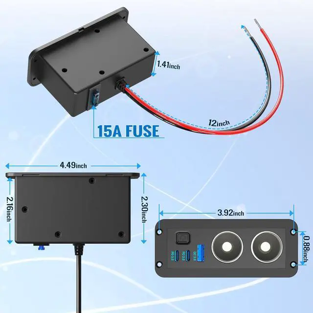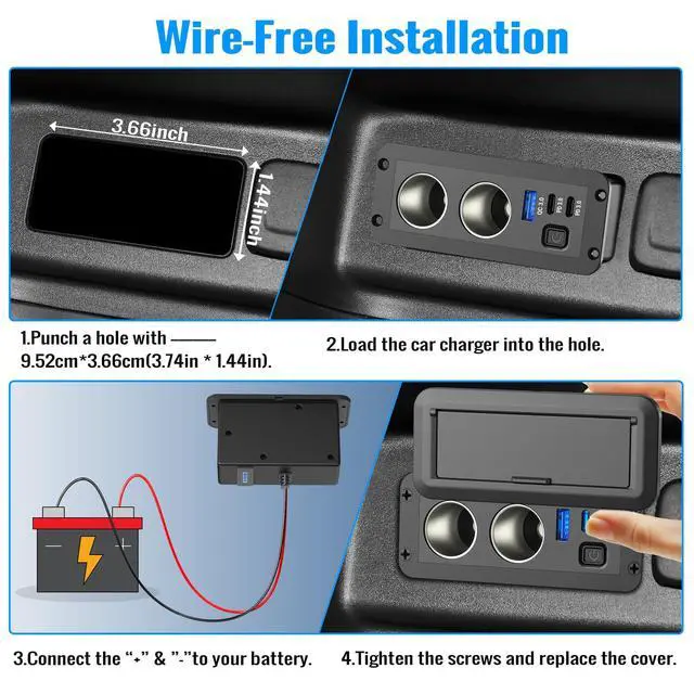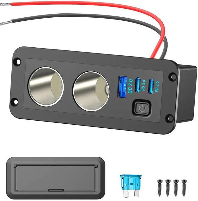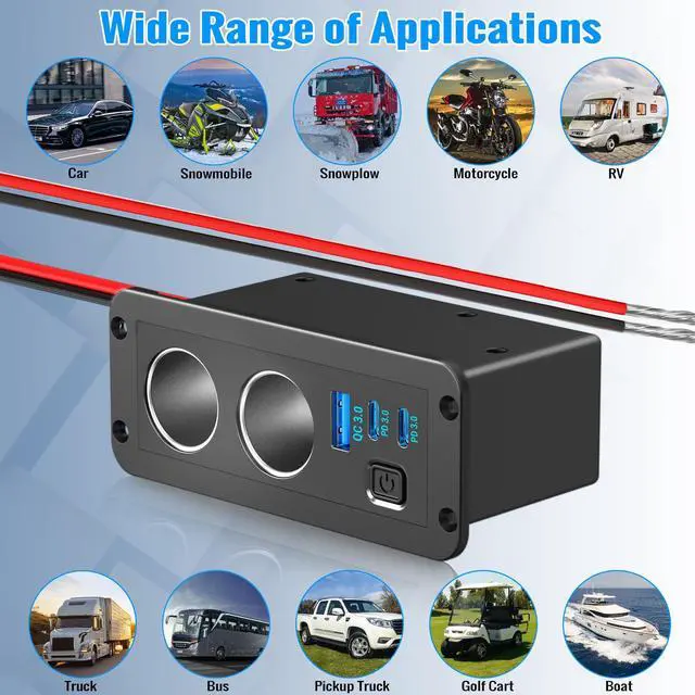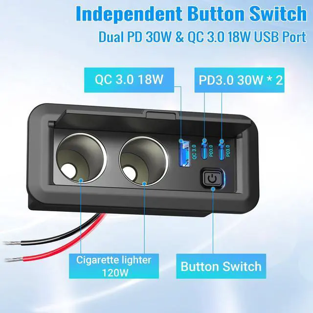 Our 12v USB power outlet is official certified with TWO 30W USB C PD fast charging ports and one 18W QC3.0 USB A fast charging port, which can meet the daily needs of cell phones, tablets, wireless chargers and other products. The maximum output power is 78W.