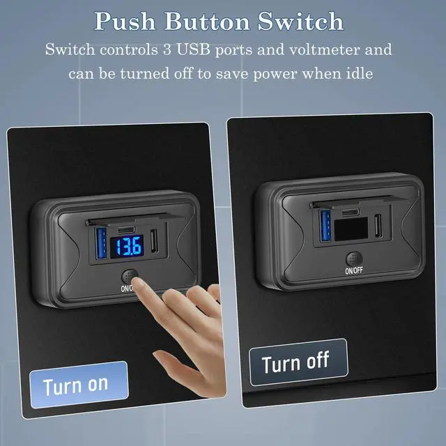 Compared to the unswitched designs on the market, our upgraded 12-volt USB socket adds a sleek, non-slip push-button switch. This prevents the battery from being drained by the LEDs being constantly lit, effectively extending the life of the battery. Note: The switch is off by default.