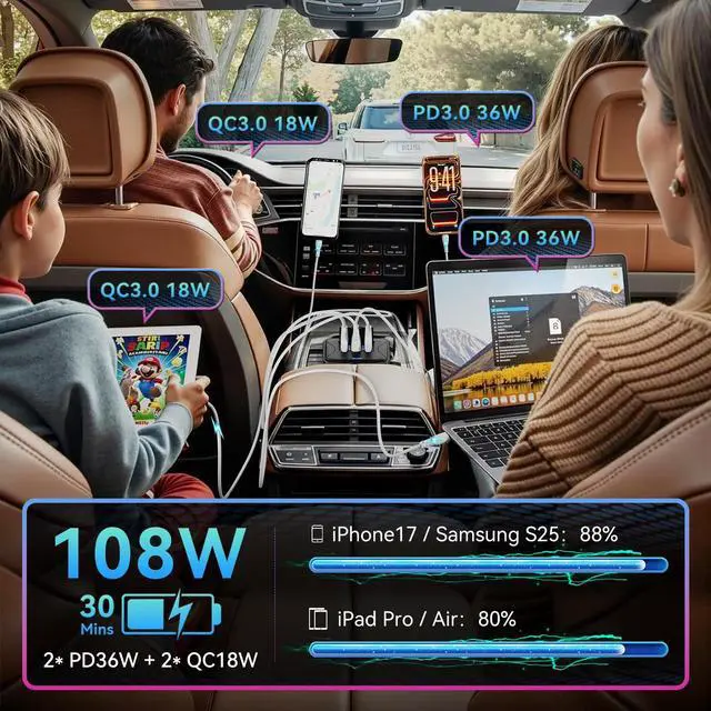 Yes! The 12 volt usb port with 4 independent ports (2 USB-C+2 USB-A), the 12 volt usb wall outlet fast charges 4 devices like phones, tablets, and cameras at once. The usb ports for rv total 108W output powers everyone in the vehicle quickly.