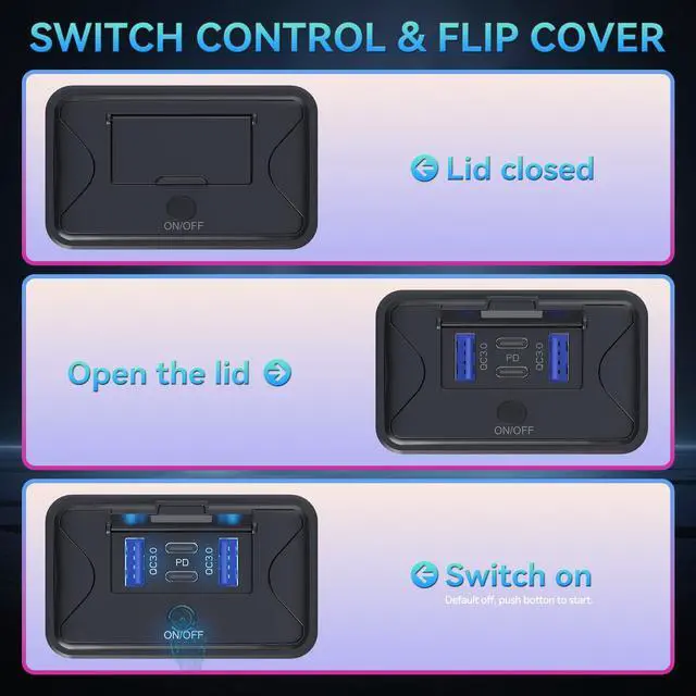 The usb port 12v has a safety switch that uses zero power when off, and a smart IC that protects against over-voltage, overheating, and shorts. The 12v usb outlet for rv housing is flame-retardant ABS. The soft blue LED helps you plug in at night.