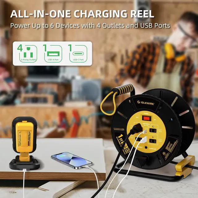 This all-in-one extension cord reel is designed to simplify power distribution and cable management in garages, workshops, and outdoor environments. Featuring 4 grounded AC outlets and dual USB ports, this open-frame extension cord storage reel with 4-grounded outlets transforms any standard cord into a long-reach garage extension cord, a versatile outdoor extension cord reel, or a portable extension cord organizer for multiple projects. Built with a 1FT power pigtail, the unit works seamlessly with extension cords of various gauges, delivering a fully customizable setup for users who need a reliable extension cord holder reel, cord reel portable, or heavy duty extension cord reel. The spacious open-frame structure functions as a high-capacity extension cord storage reel, neatly storing up to 65FT of 12/3 AWG, 80FT of 14/3 AWG, or 100FT of 16/3 AWG cableproviding organized extension cord storage that keeps cables neat, accessible, and ready for efficient use. Whether used as an extension cord wheel, extension cord spool, cord storage reel, wire reel, wire spool caddy, or power cord organizer, it ensures reliable performance across both indoor and outdoor applications. The integrated anti-twist guide keeps the extension cord on reel perfectly aligned for smooth pulling and rewinding, making it a dependable cord winder, cord roller, cable winder, electric cord reel, and manual cord reel for craftsmen, DIYers, electricians, and outdoor professionals. Engineered with a reinforced metal stand, this electrical cord reel stays stable, upright, and wobble-free during unwinding or rewinding, while the PET safety strap locks the crank in place to prevent accidental spinning. The auto-locking system ensures the cable remains securely stored, supporting efficient workflows for users who need a durable retractable extension cord reel, open reel extension cord, open reel extension cord 60ft, or electric cable reel. Designed for portability, it functions as a lightweight yet rugged hand crank cord reel that's easy to carry between garages, workshops, jobsites, and outdoor activitiesideal for anyone seeking a reliable cord reel easy to carry or portable extension cord reel solution. For added safety, the built-in 15A circuit breaker offers overload protection with a convenient reset button, and the ETL certification ensures long-lasting, compliant performance. This premium power cord reel, powercord reel, power cable spool, and cable reel holder is perfect for users who need dependable outdoor extension cord storage, extension cord roll up, storage for electric cord, reel storage case, or extension cord organizers and storage. Whether for powering tools, organizing cables, rolling up long cords, or managing power distribution on the go, this heavy-duty cord reels, cable outdoor retractable organizer, and cable organizing reel delivers performance, durability, and convenience for every project.