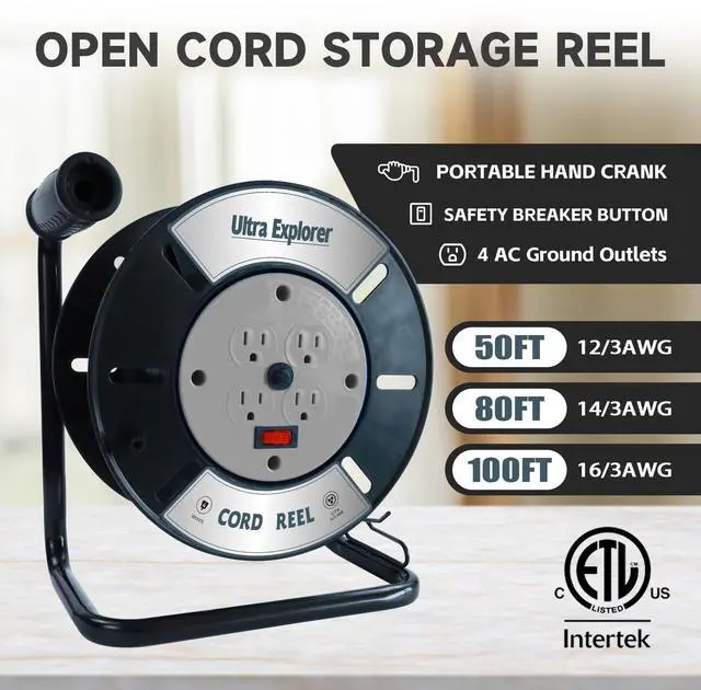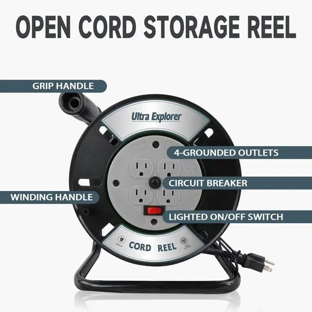 Ultra Explorer Extension Cord Storage Reel with 4-Grounded Outlets, Heavy Duty Open Cord Reel for 12/3 14/3 16/3 Power Cords, Portable Empty Hand Crank Electric Cord Roller Holder, Green