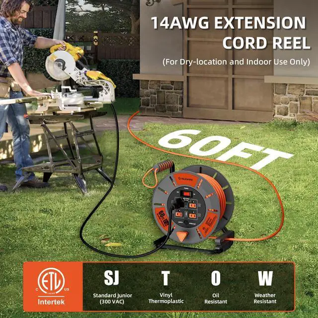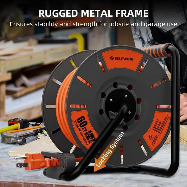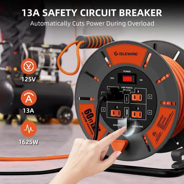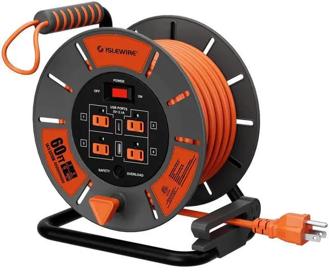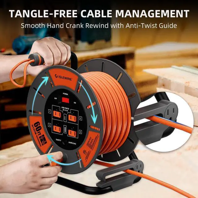The islewires 60FT extension cord reel is a powerful retractable extension cord solution designed for garages, workshops, jobsites, and outdoor projects, combining long reach, high durability, and versatile power distribution. This open reel extension cord 60ft features 4 grounded AC outlets plus dual USB ports, delivering stable 125V/13A/1625W performance for tools, appliances, and electronics, functioning as a true extension cord with multiple outlets and electrical outlet extender. Built with premium 14 gauge extension cord (14/3) SJTOW cable, this electric cord reel / power cord reel / electrical cord reel is oil-resistant, water-resistant, abrasion-resistant, and remains flexible in extreme weathermaking it an ideal heavy duty extension cord outdoor choice for professionals and homeowners. The high-visibility jacket improves safety and prevents trip hazards on dim jobsites and in dark garages. The integrated anti-twist guide ensures smooth, tangle-free use and easy rewind, transforming messy cables into an organized workspaceperfect as an extension cord organizer, extension cord storage reel, cord storage reel, or extension cord holder alternative. The reinforced metal stand provides stability, and the PET lock strap secures the crank for effortless transport and storage. This retractable power cord reel / retractable extension cord reel / automatic cord reel / retractable cable reel includes a built-in 13A circuit breaker for overload protection and a 3-prong grounded plug, fully ETL-listed for safety and reliability. Ideal for powering saws, compressors, pressure washers, lawn equipment, RV and outdoor lighting, making it a top-tier outdoor extension cord reel, portable extension cord reel, extension cord outdoor with multiple outlets, and power cable spool solution. Whether you need a professional-grade extension cord retractable reel, roll up extension cord, extension cord roll up with multiple outlets, cord reel 14/3 60ft, extension cable, cable reel, extension cord wheel, extension cord winder, or extension cord spool, this extension cord with reel offers superior power distribution, easy storage, and long-distance reachdelivering the perfect balance between traditional 50ft and bulky 100ft models. Upgrade your workspace with a reliable outdoor heavy duty extension cord, extension cord retractable indoor or outdoor, and experience cleaner setups, easier cable management, and professional-grade power anywhere you work.