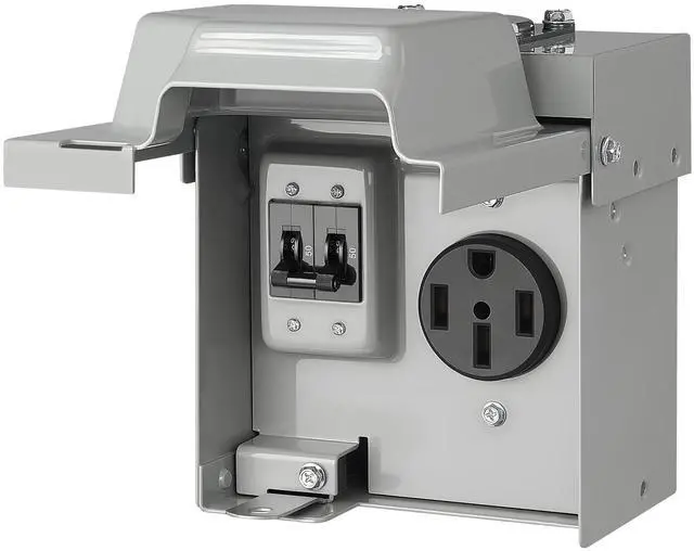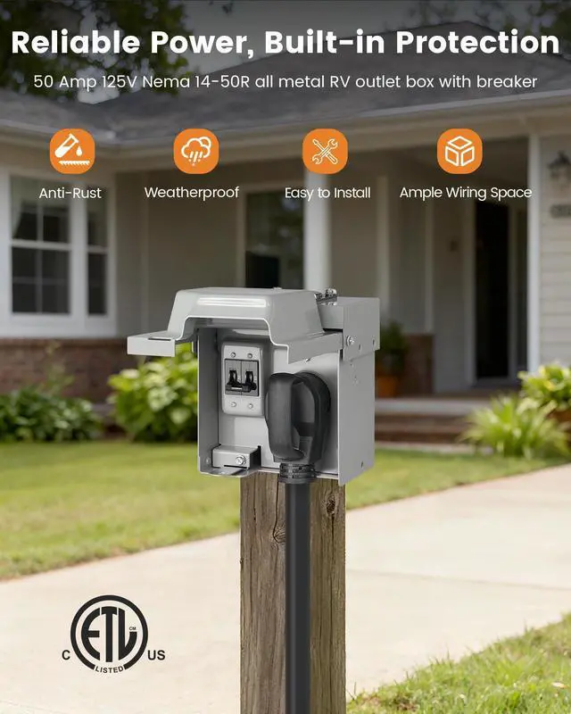 The versatile NEMA 50 AMP 125V 14-50R receptacle provides a dependable power source for RVs, campers, travel trailers, and EVs, while the ETL-certified, 3R rainproof all-metal enclosure guarantees long-lasting outdoor durability and protection against the elements.