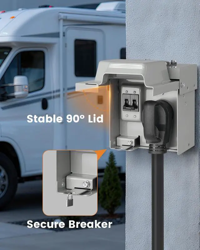 • Larger Space & Lockable Security: Spacious interior allows for easy wiring and accommodates heavy-duty RV power cords. Equipped with a lockable cover and extended latch, it secures outlets for safe use at RV parks, campsites, and public installations