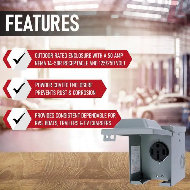 A 50 amp electrical panel with an outdoor rated NEMA 14-50R receptacle and 125/250 volts