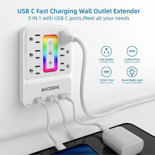 AICODEwall outlet extender with USB C creats a charging station for bedroom, bathroom,kitchen and any other area.This wall surge protector with 900J surge protection,built-in smart circuit automatically detect and protect your devices.
