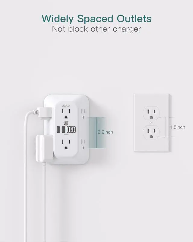 6 AC outlets surge protector with 2.2 inches long space in between, Unlike the standard 1.5-inch socket. Larger spacing makes it easier to use for all kinds of equipment.