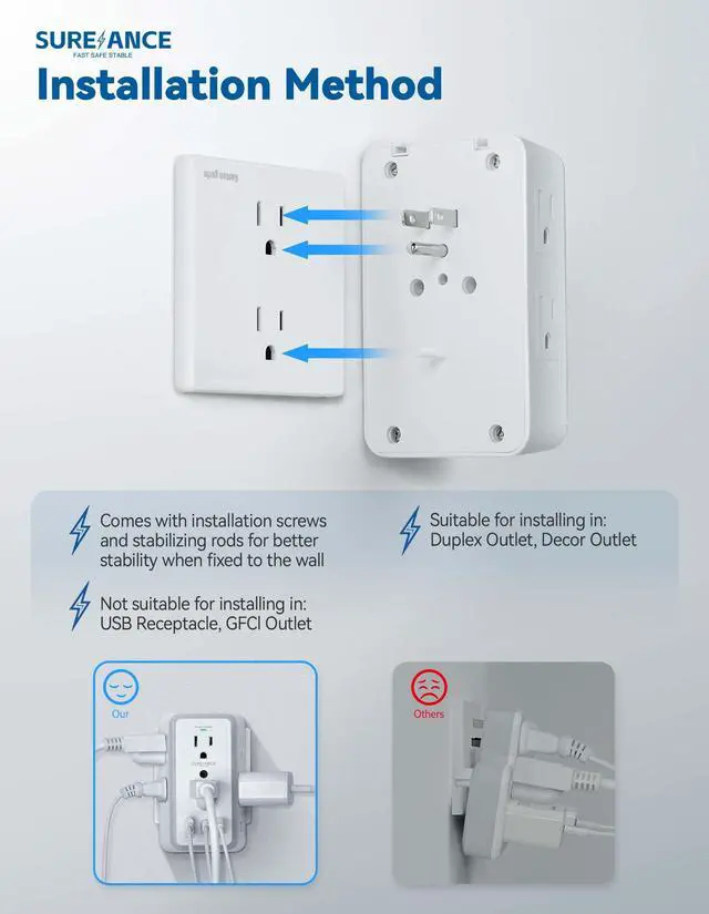 Our multi plug wall outlet includes stabilizing rods to ensure secure mounting on the wall. The wall outlet with night light is designed for easy installation in Duplex Outlets and Decor Outlets. Please note that it is not suitable for installation in USB Receptacles or GFCl Outlets.