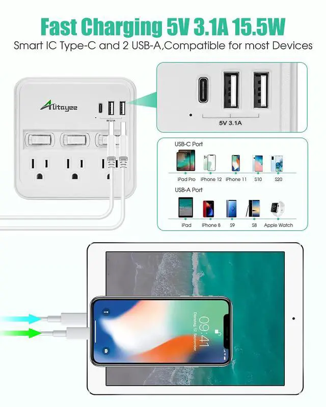 Compact Size and Worldwide Voltage-the USB Vertical Power Strip provide 3 Widely-spaced Outlets and 5V 3.1A Fast Charging USB Ports(1Type-C and 2 Type-A),Compatible many devices and for travel,office,dorm ,home,and so on.