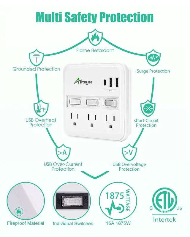 With a built-in 490J surge protector, our outlet extender power strip with usb ports will filter the minor surges in the circuit and shut it off when an overwhelming surge like that caused by lightning occurs. And the shell is made of Flame Retardant Material which is able to withstand temperature up to 1,380? (750?).
