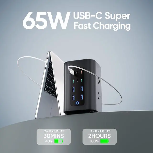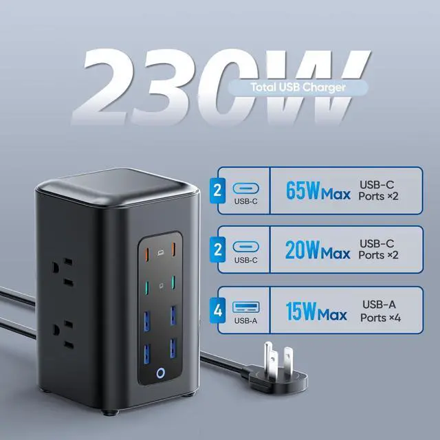 230W Total Fast Charging StationThis power strip features 8 USB ports, including two orange USB-C Super Fast Charging ports (65W max), two green USB-C Fast Charging ports (20W max), and four blue USB-A ports (15W max). This charging tower easily handles fast charging for your phone, tablet, and other essentials simultaneously, meeting all your daily fast-charging needs.