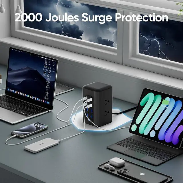 2000J Surge Protector TowerBuilt with a 2000J surge protector, this power strip instantly absorbs massive power surges up to 2000 joules, safeguarding your devices against lightning strikes, power grid fluctuations, or aging wiring issues for greater peace of mind, longer-lasting electronics, and truly worry-free protection.