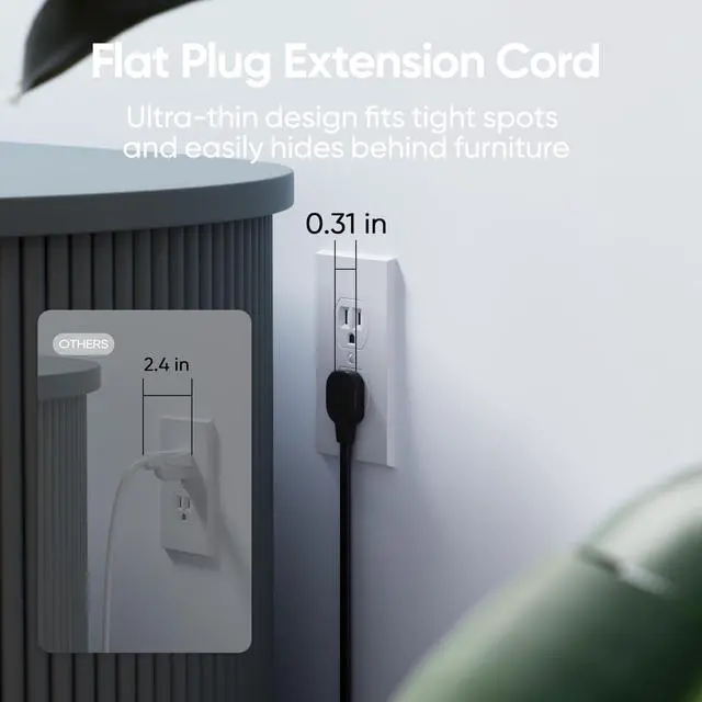 Flat Plug & 5FT Extension CordFeatures an ultra-slim 0.31-inch plug that hugs the wall and a flat 0.118-inch cord that lies flat against floors or walls, easily tucking into tight spaces for a clean, low-profile look anywhere, ideal for daily use, travel, homes, offices, and dorms.