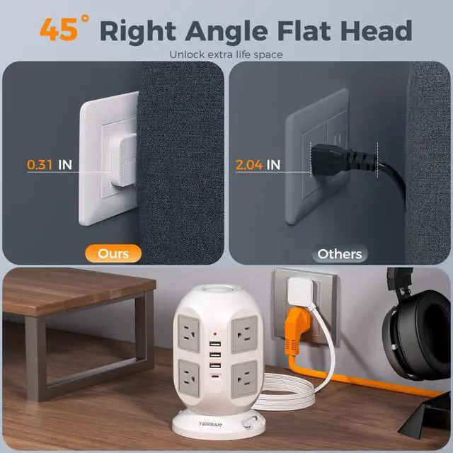 The ultra thin flat plug can be hidden behind narrow space behind bed, furniture, refrigerator and so on, 45 degree flat plug does not cover other outlets, making better utilization of indoor space