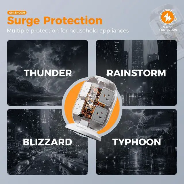 This power strip with USB ports features surge protection, overload protection, short-circuit protection, over-current protection, and etc; The overload switch will trip off automatically to protect your devices from power surge attactks
