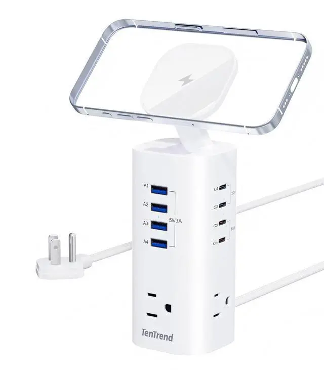One for All Power Strip TowerEquipped with 3 AC Outlets, 4 USB-A ports, 4 USB-C ports (4*Fast charging port) and 1 magnetic charging top, it is a multi-functional charging solution that can charge tablets, cellphones, iphone 14/15 or other devices at the same time.