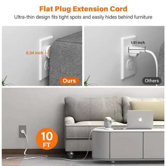 The right-angled flat plug makes accessing the wall outlets blocked by furniture or reaching cramped areas easily.