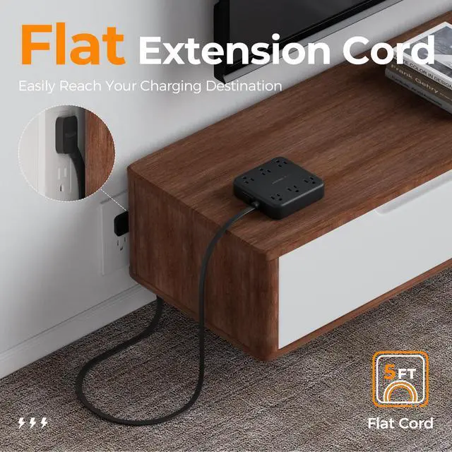 The 45° angled flat plug extension cord fits into tight spaces, prevents blocking the outlet below, and tucks neatly behind furniture.