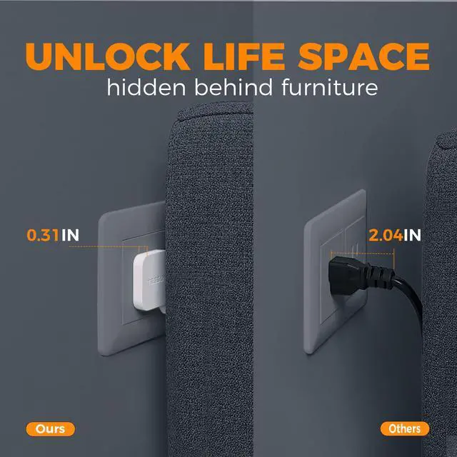 5ft Ultra-thin flat cord design can fit easily in tight spaces, such as desk, nightstand; 45° right angle makes it not block the other outlet below